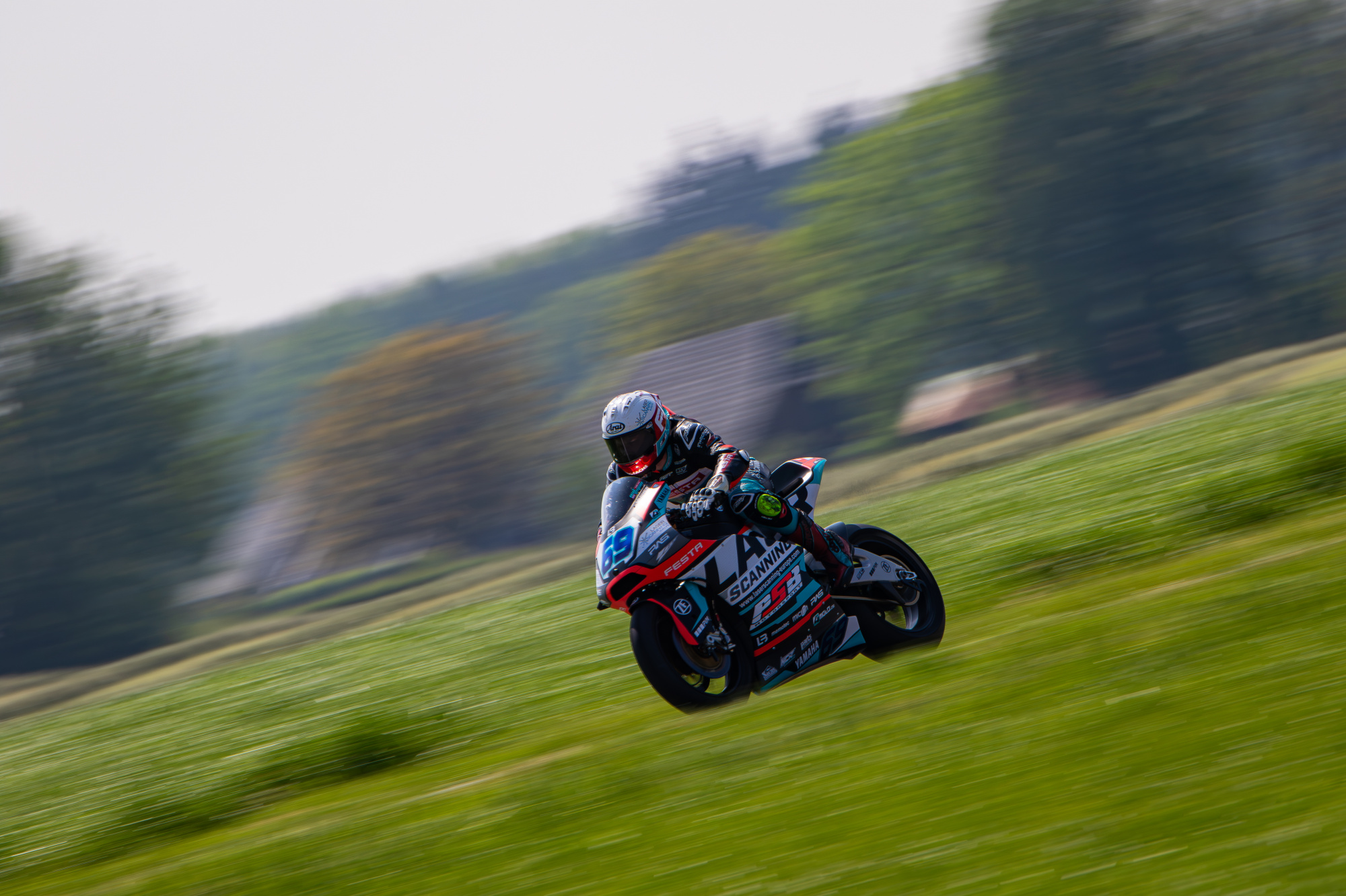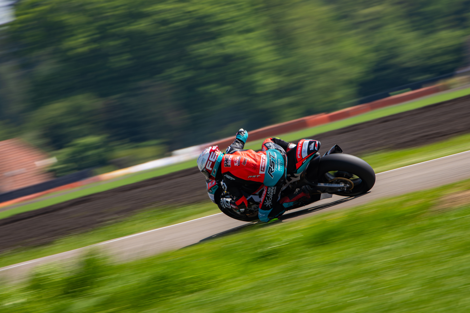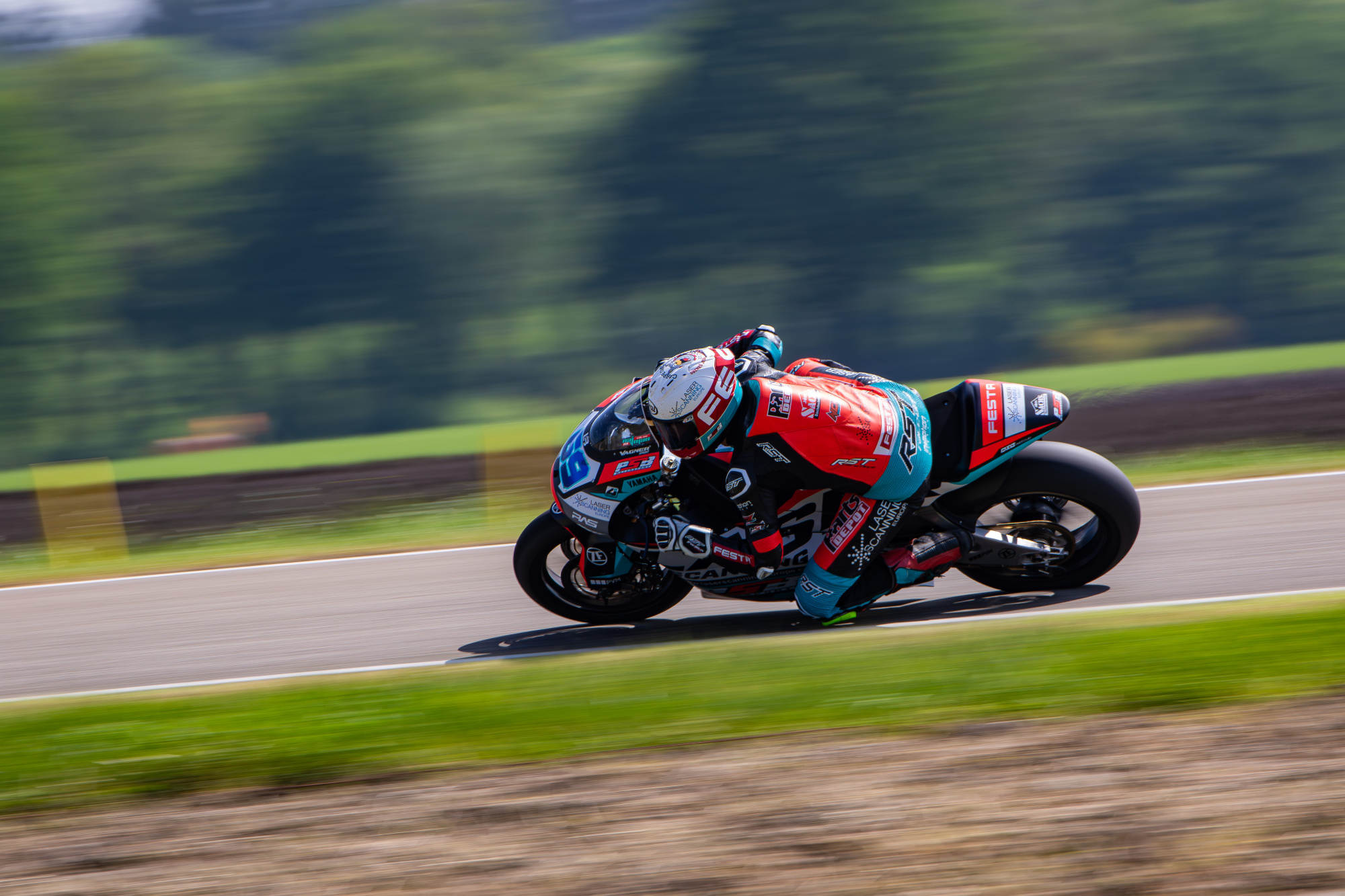 V neděli jsme se opět probudili do mokrého počasí, ale už to vypadalo, že pršet nebude. Trať byla taková půl na půl, takže jsem do prvního dopoledního závodu zvolil mokré pneumatiky. To se nakonec ukázalo jako chyba, protože trať začala během závodu rychle osychat. Start se mi moc nepodařil a ztratil jsem kontakt s prvními jezdci. Během dvou kol se mi je podařilo dotáhnout a začali jsme společně bojovat. Neustále jsme si měnili místa od prvního do třetího a jeli v rozdílu půl vteřiny. V předposledním kole jsem byl první s lehkým náskokem, ale tím, že jsem jel na mokrých pneumatikách a trať už byla přibližně ze 70% suchá, tak jsem dostal highsidera na výjezdu na cílovou rovinku. To mě hodně rozhodilo a během toho mě ostatní opět předjeli. V posledním kole se mi podařilo zpátky dostat na druhé místo a do poslední zatáčky jel bok po boku s prvním. Opět jsem ale na výjezdu dostal dalšího highsidera, vyjel z dráhy a oba mě předjeli. Závod jsem dokončil na třetím místě, což mě trochu mrzí, protože vím, že to mohlo být lepší. I tak jsem v závodě získal hodně zkušeností, protože to byly parádní souboje.