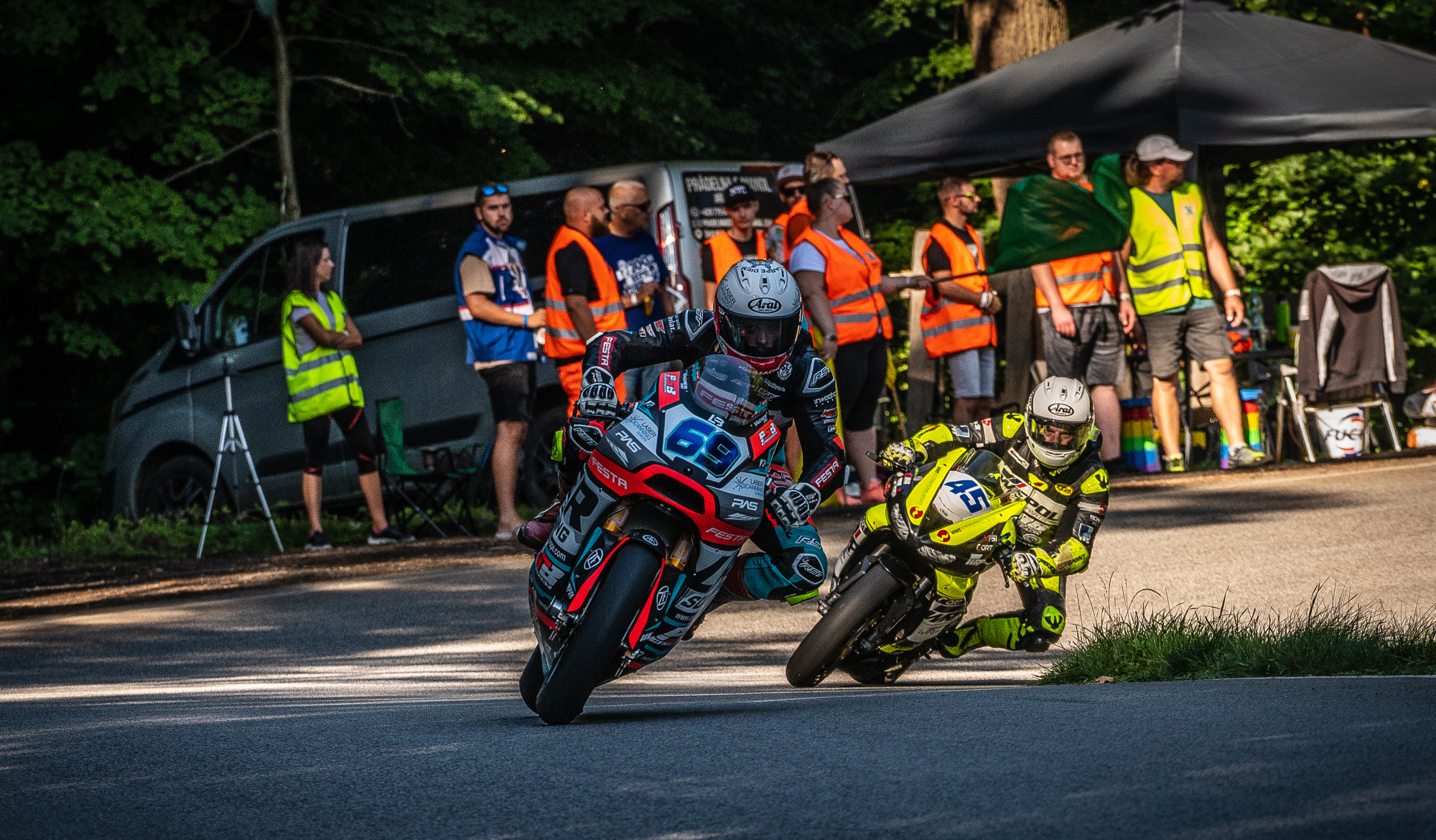 V neděli ráno jsme se svezli ve Warm Upu a čekali na druhý závod, který byl na jedenáct kol. To už byla slušná porce kol oproti sobotním šesti. Start se mi podařil, ale byl jsem opět druhý za Markem Červeným. První zatáčku jsem si najel lépe než Marek, takže jsem měl lepší výjezd a hned jsem ho do kopce předjel. Tím pádem jsem se v prvním kole ujal vedení. Marek se mě stále držel a já věděl, že nemám žádný náskok. Rozdíl byl jen pár metrů. Do toho jsme dohnali pomalejší jezdce o kolo a já čekal, že mě v tu chvíli Marek předjede, že najde nějakou skulinu. Nakonec se tak nestalo. Předjížděli jsme spoustu lidí, ale pořád jsem si držel první pozici. Při nájezdu do posledního kola jsem viděl, že mám náskok okolo 1,5 – 2 vteřin. V tomto kole byla nakonec vyvěšena červená vlajka a závod byl ukončen. Byla odjeta většina závodu, takže to znamenalo, že je konec. Zvítězil jsem i ve druhé závodě, navíc jsem zajel čas 2:13,5, opět nejrychlejší kolo závodu. Byl jsem velice šťastný, protože jsem v Brně jel dvakrát a vždycky jsem byl druhý. Nyní se mi podařilo dvakrát zvítězit, navíc se skvělým časem. Tím pádem jsem také vybojoval mistra České republiky pod AČR, CAMSem i pod Slovenskou motocyklovou federací. Měli jsme z toho obrovskou radost.
